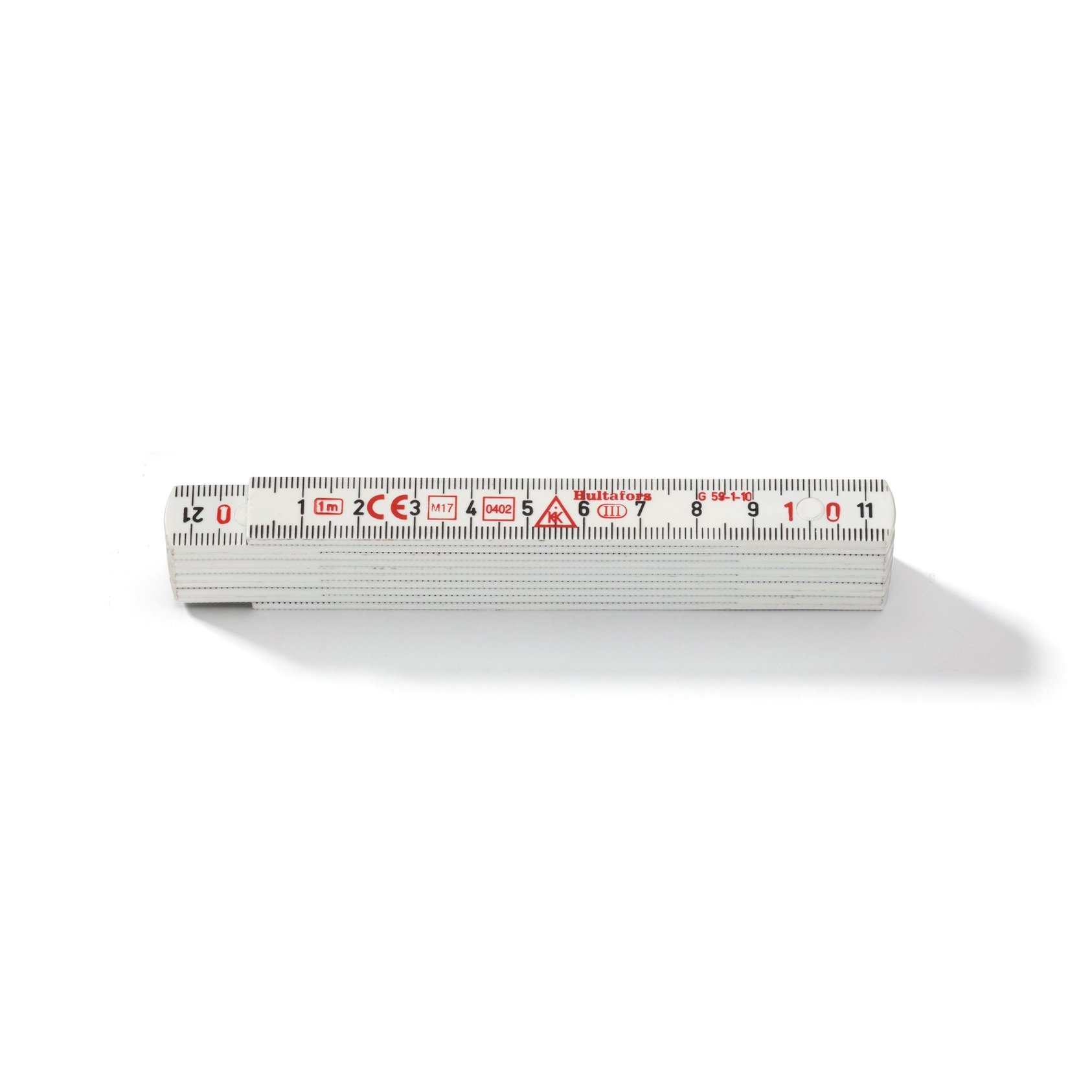 Mètre pliant en polyamide renforcé de fibre de verre, offrant une résistance accrue à l'humidité. Échelle métrique en noir des deux côtés et chiffres décimètres en rouge.
