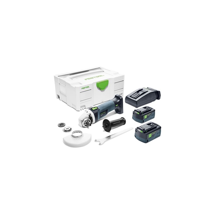 2 x Akkupack BP 18 Li 5,2 AS, Schnellladegerät TCL 6, Schutzhaube SH-AGC 18, Zusatzhandgriff VIBRASTOP, Schnellspannmutter QRN-AGC 18, Flansch BF-AGC 18, Stirnlochschlüssel KF-AGC 18, im SYSTAINER SYS 2 T-LOC