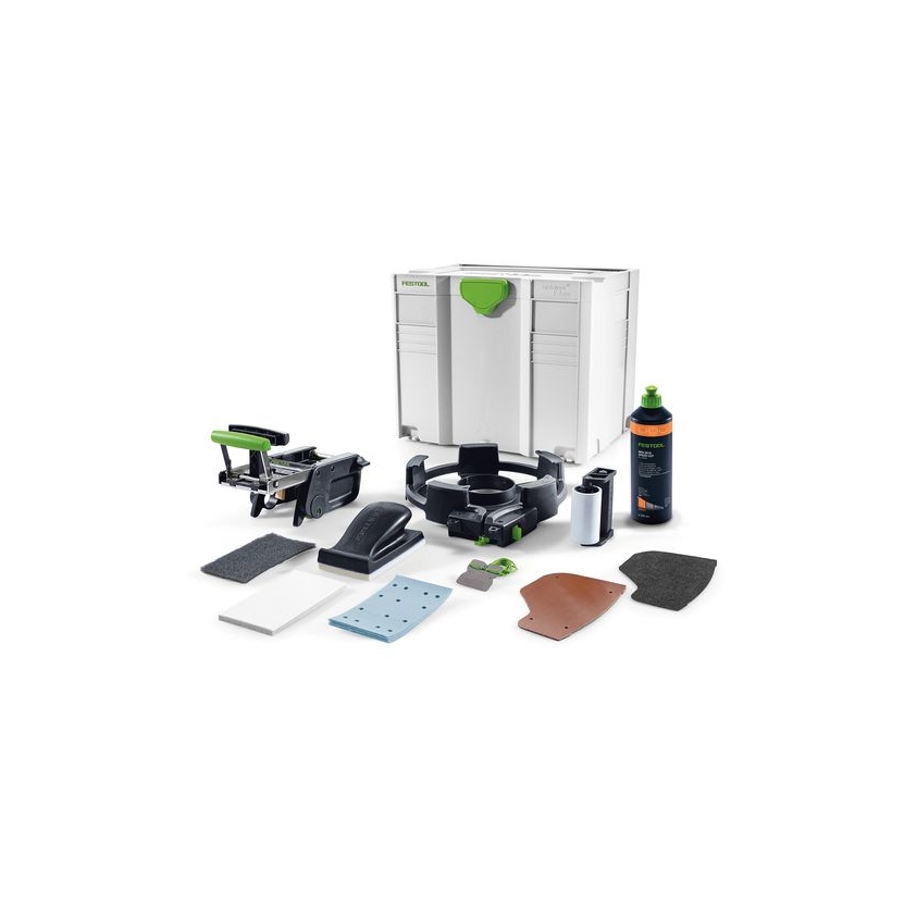 magasin de stockage, 20 abrasifs StickFix Granat 80 x 133 P320, rouleau de pression supplémentaire, plaqueuse, cale de ponçage HSK 80 x 133 H, plaquette à racler, semelle protection contre les rayures avec 3 feutres, feutre de polissage, feutre de polissage StickFix S 800, produit de polissage MPA 5010 OR, Systainer SYS 4 TL, en emballage carton